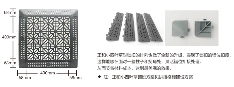 正和小四葉草采用通扣設(shè)計,可以確保產(chǎn)品鋪設(shè)完成后在任何區(qū)域單獨取出,極大的方便了客戶后期局部清理泥沙等,給店面的日常衛(wèi)生維護提供了很好的基礎(chǔ)。
