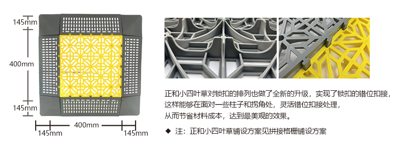 正和小四葉草采用通扣設計,可以確保產品鋪設完成后在任何區(qū)域單獨取出,極大的方便了客戶后期局部清理泥沙等,給店面的日常衛(wèi)生維護提供了很好的基礎。