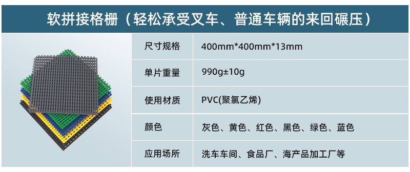 正和軟拼接格柵(專利號ZL201520725751.X)由加厚型實心條狀支撐縱橫交織,寬大的排水孔便于水和泥沙的排出和流動。下方密布數百個實心防滑支撐點,每平米承重高達10噸以上,輕松承受叉車、普通車輛的來回碾壓,特別適合在洗車車間、食品廠、海產品加工廠等有水地面,也可以作為企事業(yè)單位迎賓除塵墊使用。