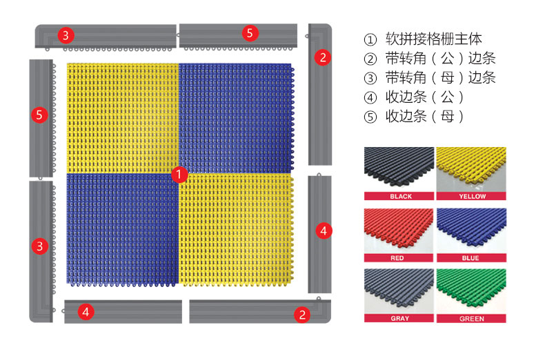 正和軟拼接格柵整體為正方形結構,采用矩陣式密集鎖扣連接,扣接牢固,施工簡單,多種色彩可供搭配,鋪設之后整齊美觀。產品整體采用軟性材料,讓清掃衛(wèi)生變得更加簡單,只要將整體地面卷起即可清理下方地面,高效便捷。