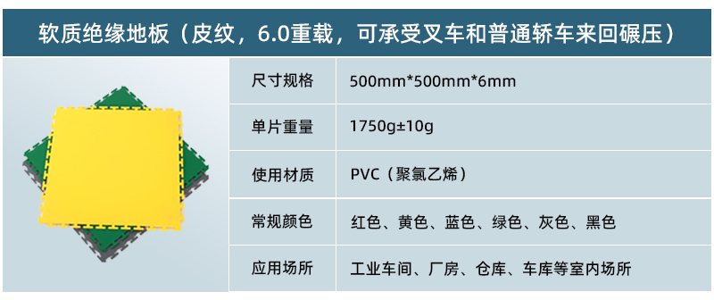 軟質(zhì)絕緣地板能將每個(gè)獨(dú)立的地板快速拼裝成整體地面,專利型鎖扣結(jié)構(gòu)連接能力更強(qiáng),可承受叉車的來回碾壓。施工過程中無需膠黏劑等材質(zhì),具有施工簡(jiǎn)單快速、色彩絢麗、美觀大方、可移動(dòng)性強(qiáng)、可重復(fù)使用等特點(diǎn)。