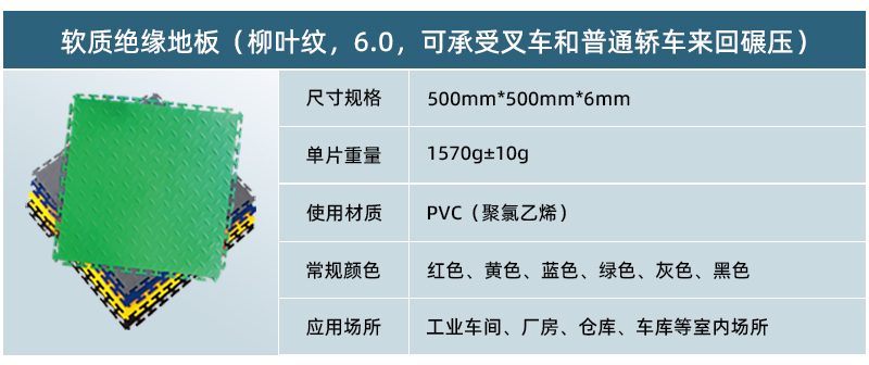 6、色彩絢,易搭配: 軟質(zhì)絕緣地板常規(guī)顏色為紅色、黃色、黑色、灰色、藍(lán)色、綠色等顏色,也可根據(jù)客戶的要求進(jìn)行色彩的調(diào)整。正方形