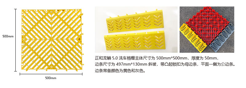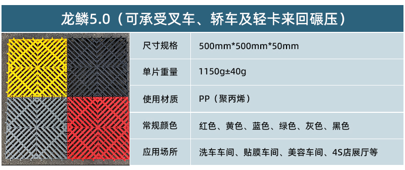 1.龍鱗紋設(shè)計,防滑,美觀,寓意好 2.選用高級原料,加入其他輔料,顏色亮麗,無異味,無污染 3.顏色為紅黃藍綠黑灰六色,滿足客戶用色需求,搭配屬于自己的風(fēng)格 4.通扣鎖扣設(shè)計,容易鋪設(shè)且容易拆卸打理 5.加強支撐,不容易出現(xiàn)壓壞壓斷現(xiàn)象,滿足大多數(shù)車輛施工的要求 6.使用年限長,3年超長質(zhì)保,使用無后顧之憂 7.不同厚度,采用不同支撐,保證承載最大化的同時,且易排泥排水