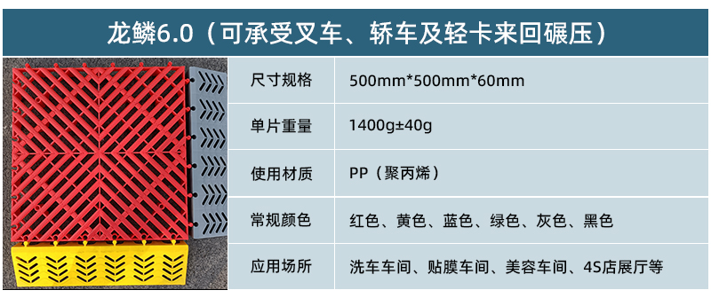 1.龍鱗紋設計,防滑,美觀,寓意好 2.選用高級原料,加入其他輔料,顏色亮麗,無異味,無污染 3.顏色為紅黃藍綠黑灰六色,滿足客戶用色需求,搭配屬于自己的風格 4.通扣鎖扣設計,容易鋪設且容易拆卸打理 5.加強支撐,不容易出現(xiàn)壓壞壓斷現(xiàn)象,滿足大多數車輛施工的要求 6.使用年限長,3年超長質保,使用無后顧之憂 7.不同厚度,采用不同支撐,保證承載最大化的同時,且易排泥排水
